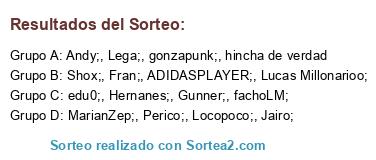 Lista de participantes: hincha de verdad, Hernanes;, gonzapunk;, Lega;, Shox;, fachoLM;, Locopoco;, Fran;, Jairo;, Andy;, edu0;, Perico;, Gunner;, ADIDASPLAYER;, Lucas Millonarioo;, MarianZep;.