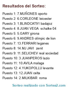Lista de participantes: Mariomartinely (fiorentina), Pedrin2106 (leverkusen), Josema (monaco), Alberto (leganes), Xevi (liverpool), Danimun92 (real sociedad), Acostillador82 (real madrid), Killote21 (roma).