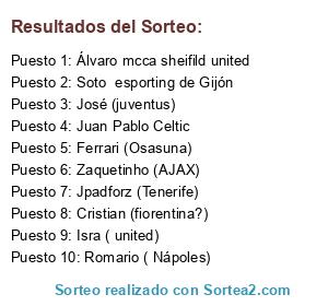 Lista de participantes: Zaquetinho (AJAX), Cristian (fiorentina?), Jpadforz (Tenerife), Isra ( united), Ferrari (Osasuna), Romario ( Nápoles), José (juventus), Soto esporting de Gijón, Álvaro mcca sheifild united, Juan Pablo Celtic.