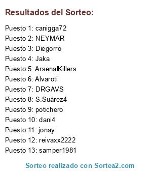 Lista de participantes: DRGAVS, samper1981, ArsenalKillers, potichero, reivaxx2222, dani4, S.Suárez4, canigga72, Diegorro, Jaka, jonay, NEYMAR, Alvaroti, .