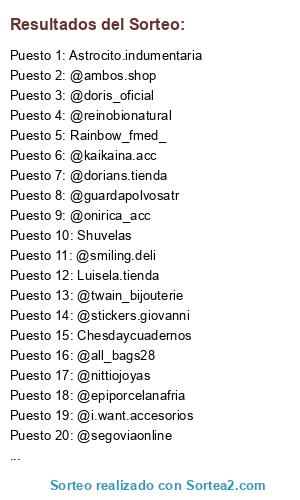 Lista de participantes: @pinssanmiguel, @guardapolvosatr, Luisela.tienda, @epiporcelanafria, @doris_oficial, @reinobionatural, @i.want.accesorios, Rainbow_fmed_, Shuvelas, @smiling.deli, @all_bags28, Astrocito.indumentaria, @nittiojoyas, @dorians.tienda, @kaikaina.acc, @segoviaonline, @onirica_acc, @stickers.giovanni, @ambos.shop, Chesdaycuadernos, @twain_bijouterie.