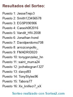 Lista de participantes: davyd93, Tabora77, Davidperdomo708, Vandit_HN-2008, Xx_knifecr7_xX, jochebogran1327, TonyStyles96, Smith123456578, Jonathan-hond, JesseTrejo3, saint_muma24, arrozconpollo_, FMADRID020, Carash082016, EGSP090906, tonygonzalez_hn.