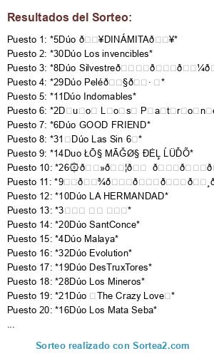 Lista de participantes: *1Dúo PIMPINELA*, *2D͎u͎o͎ L͎o͎s͎ P͎a͎t͎r͎o͎n͎e͎s͎*, *3ꀷꀎꂦ ꀷꏂ ꂦꋪꂦ*, *4Dúo Malaya*, *5Dúo 🔥DINÁMITA🔥*, *6Dúo GOOD FRIEND*, *7🫶🏻ɖนσ ℘εгʄεɕtσ🫶🏻*, *8Dúo Silvestre🕊️🙏🏼🛐*, *9❦︎𝕾𝖔𝖚𝖑𝕸𝖆𝖙𝖊 𝕴𝖓 𝕷𝖚𝖉𝖔❦︎*, *10Dúo LA HERMANDAD*, *11Dúo Indomables*, *12💙 • *~Dᴜ́ᴏ DɪɴᴀᴍɪᴄO~* • ♥️, *13Dúo ALFA Y OMEGA*, *14Duo ŁŌ§ MĀĞØ§ ĐĖĻ ĹÜĎÕ*, *15Dúo TH£ B@nd!døs*, *16Dúo Los Mata Seba*, *17Dúo DEMENTE'S*, *18Duo Los Fieles*, *19Dúo DesTruxTores*, *20Dúo SantConce*, *21Dúo ✰The Crazy Love✰*, *22Dúo Los Inseparables*, *23Dúo The Crazy Artist*, *24Dúo Los Sicarios*, *25Duo Las babys*, *26۞𝔻𝕦𝕠 𝕃𝕒𝕤 𝕃𝕖𝕪𝕖𝕟𝕕𝕒𝕤۞*, *27Dúo Los Cazadores 😎*, *28Dúo Los Mineros*, *29Dúo Pelé🇧🇷 ⚽*, *30Dúo Los invencibles*, *31✜Dúo Las Sin 6✜*, *32Dúo Evolution*.