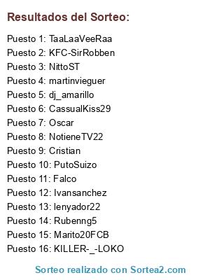 Lista de participantes: NittoST, TaaLaaVeeRaa, NotieneTV22, KILLER-_-LOKO, Rubenng5, PutoSuizo, KFC-SirRobben, Marito20FCB, Ivansanchez, lenyador22, dj_amarillo, CassualKiss29, Cristian, Oscar, Falco, martinvieguer.