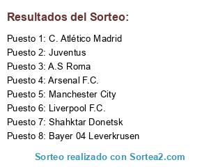 Lista de participantes: Arsenal F.C., Liverpool F.C., Manchester City, Juventus, A.S Roma, Bayer 04 Leverkrusen, C. Atlético Madrid, Shahktar Donetsk.