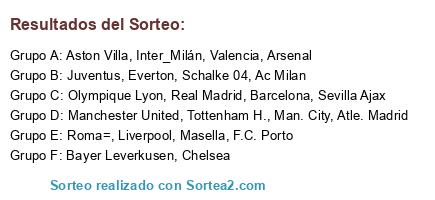 Lista de participantes: Real Madrid, Barcelona, Arsenal, Man. City, Manchester United, Chelsea, Inter_Milán, Ac Milan, Liverpool, F.C. Porto, Atle. Madrid, Valencia, Juventus, Everton, Tottenham H., Bayer Leverkusen, Roma=, Aston Villa, Sevilla Ajax, Masella, Olympique Lyon, Schalke 04.