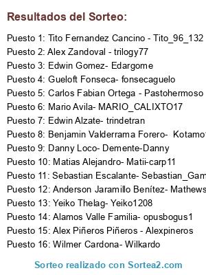 Lista de participantes: Alex Piñeros Piñeros - Alexpineros, Edwin Alzate- trindetran, Edwin Gomez- Edargome, Alex Zandoval - trilogy77, Sebastian Escalante- Sebastian_Gamer9, Mario Avila- MARIO_CALIXTO17, Carlos Fabian Ortega - Pastohermoso, Yeiko Thelag- Yeiko1208, Wilmer Cardona- Wilkardo, Benjamin Valderrama Forero- Kotamo1018454, Anderson Jaramillo Benítez- Mathewspazzo, Gueloft Fonseca- fonsecaguelo, Tito Fernandez Cancino - Tito_96_132, Danny Loco- Demente-Danny, Alamos Valle Familia- opusbogus1, Matias Alejandro- Matii-carp11.