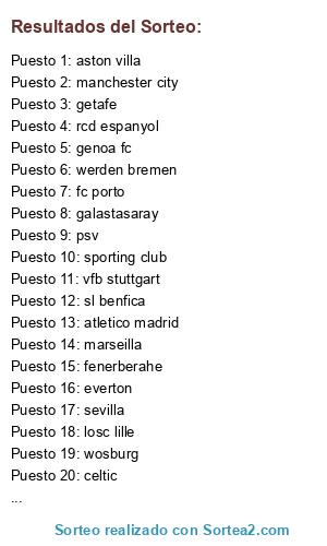 Lista de participantes: us palermo, panathinaikos, wosburg, braga, tottenhan hospurs, rcd espanyol, sevilla, everton, aston villa, dynamo kiev, genoa fc, vfb stuttgart, sl benfica, lech poznan, losc lille, sampdoria, manchester city, napoli, atletico madrid, galastasaray, borusia dortmund, sporting club, getafe, rubin kasan, marseilla, fc porto, rsl anderleth, zenit sp, psv, werden bremen, celtic, fenerberahe.