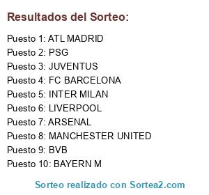 Lista de participantes: FC BARCELONA, BAYERN M, ARSENAL, LIVERPOOL, INTER MILAN, PSG, JUVENTUS, BVB, MANCHESTER UNITED, ATL MADRID.