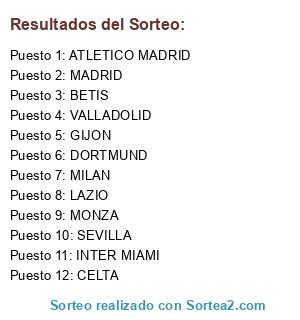 Lista de participantes: MADRID, SEVILLA, MILAN, LAZIO, MONZA, BETIS, DORTMUND, CELTA, VALLADOLID, INTER MIAMI, GIJON, ATLETICO MADRID.