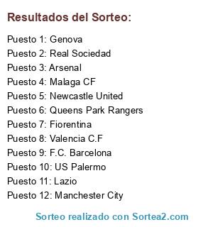 Lista de participantes: Real Sociedad, Lazio, Fiorentina, Genova, US Palermo, Newcastle United, Queens Park Rangers, Manchester City, Arsenal, Malaga CF, F.C. Barcelona, Valencia C.F.
