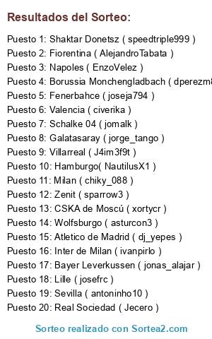 Lista de participantes: Shaktar Donetsz ( speedtriple999 ), Atletico de Madrid ( dj_yepes ), Wolfsburgo ( asturcon3 ), CSKA de Moscú ( xortycr ), Galatasaray ( jorge_tango ), Fiorentina ( AlejandroTabata ), Napoles ( EnzoVelez ), Zenit ( sparrow3 ), Real Sociedad ( Jecero ), Bayer Leverkussen ( jonas_alajar ), Inter de Milan ( ivanpirlo ), Hamburgo( NautilusX1 ), Milan ( chiky_088 ), Valencia ( civerika ), Lille ( josefrc ), Fenerbahce ( joseja794 ), Villarreal ( J4im3f9t ), Schalke 04 ( jomalk ), Borussia Monchengladbach ( dperezm87 ), Sevilla ( antoninho10 ).