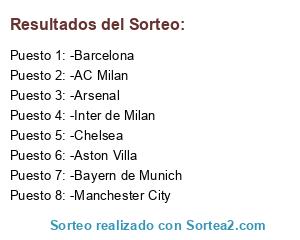 Lista de participantes: -Inter de Milan, -AC Milan, -Bayern de Munich, -Aston Villa, -Chelsea, -Barcelona, -Arsenal, -Manchester City.
