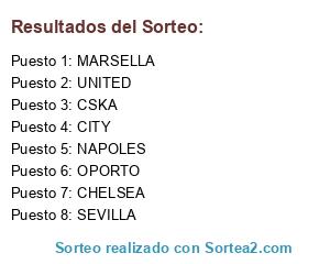 Lista de participantes: SEVILLA, CSKA, NAPOLES, OPORTO, MARSELLA, UNITED, CITY, CHELSEA.
