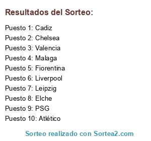 Lista de participantes: Leipzig, Cadiz, Liverpool, Fiorentina, PSG, Valencia, Malaga, Atlético, Chelsea, Elche.
