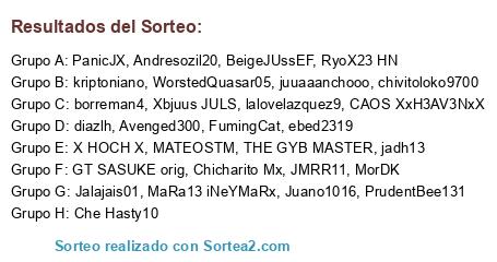Lista de participantes: Juano1016, MATEOSTM, lalovelazquez9, PrudentBee131, ebed2319, GT SASUKE orig, WorstedQuasar05, CAOS XxH3AV3NxX, PanicJX, MorDK, RyoX23 HN, Avenged300, THE GYB MASTER, Jalajais01, Chicharito Mx, juuaaanchooo, Xbjuus JULS, chivitoloko9700, diazlh, borreman4, kriptoniano, Andresozil20, JMRR11, FumingCat, jadh13, Che Hasty10, X HOCH X, BeigeJUssEF, MaRa13 iNeYMaRx.