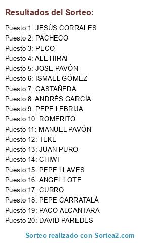 Lista de participantes: PEPE LEBRIJA, ISMAEL GÓMEZ, PECO, DAVID PAREDES, CURRO, JESÚS CORRALES, CHIWI, PACHECO, PEPE LLAVES, TEKE, JUAN PURO, ALE HIRAI, ROMERITO, PACO ALCANTARA, ANDRÉS GARCÍA, CASTAÑEDA, JOSE PAVÓN, ANGEL LOTE, MANUEL PAVÓN, PEPE CARRATALÁ.