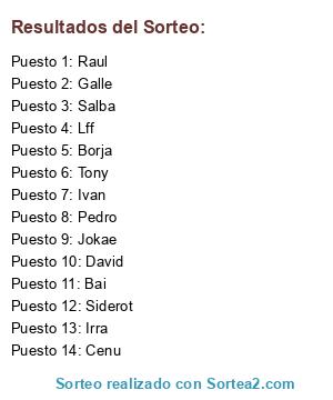 Lista de participantes: Salba, Galle, Cenu, Siderot, Jokae, Borja, Lff, Tony, Irra, David, Raul, Pedro, Ivan, Bai.