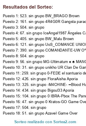 Lista de participantes: 1. sin grupo mega th The Hoolligans, 2. sin grupo Underwold_10 equipo legendario, 3. sin grupo (-- Derde_ ▓Delírium trémens▓, 4. sin grupo UNIRSE_ ↓....Tyrant Virus,,,,↓, 5. sin grupo Jorge_its, 6. sin grupo Dark_Pegasus ~~El Rincon De la Perla~~, 7. sin grupo the marine 15 The Hoolligans, 8. sin grupo 0 SkySword The Pandora´s Box, 9. sin grupo Mordreut Internacionalistas, 10. sin grupo unoderute-int Internacionalistas, 11. sin grupo mamr29 Internacionalistas, 12. sin grupo Saylara_SB clan de ur, 13. sin grupo Fabio CunhaUR, 14. sin grupo Strongermx †..::¡F34R!::..†, 15. sin grupo king brother The Hoolligans, 16. sin grupo all (et) ☩ El Templo ☩, 17. sin grupo 0 HamersleY 0 El Ekipo A., 18. sin grupo CC_C3r3al [•Clintz City•], 19. sin grupo Ager CC [•Clintz City•], 20. sin grupo CC Renardus [•Clintz City•], 21. sin grupo Exc-Ademar The Hoolligans, 22. sin grupo -A-Ignacius, 23. sin grupo emi-gar-007 Game Over, 24. sin grupo CC_Trang-Oul [•Clintz City•], 25. sin grupo Cazador GO Game Over, 26. sin grupo V-Corvo Unidos hasta el final, 27. sin grupo Lord-James Friends Of Fate, 28. sin grupo richi007008 Unidos hasta el final, 29. sin grupo - Elmas - Las Murallas, 30. sin grupo WITHOUT SHADO **** MANAGERS TEAN ****, 31. sin grupo unikho UR Clan De Ganadores, 32. sin grupo LDS-Elmo ₪ ₪ Los Diablos₪ ₪, 33. sin grupo infrenom La Asamblea, 34. sin grupo lord infierno, 35. sin grupo -NO-salban Discipulos de Jako, 36. sin grupo Di-erika DRAGONES IBEROS, 37. sin grupo 0-divas Ángeles Caídos, 38. sin grupo PV_tiranica Pistachia vera, 39. sin grupo AS-NORTE-PV Pistachia vera, 40. sin grupo TD_0wN3r La Taverne de Dionysos, 41. sin grupo OLY-Ricking7 Olympie(c), 42. sin grupo DCL lezard69 Demain c'est loin, 43. sin grupo PA_Montezuma Piratas do Atlântico, 44. sin grupo urkhan_ADV Auberge des voyageurs, 45. sin grupo asesinobrutal La Asamblea, 46. sin grupo Tyrael_(PV) Pistachia vera, 47. sin grupo 0 Kratos-GO Game Over, 48. sin grupo FD_Coyote Eternal Dragons, 49. sin grupo Brunno47 LIBERTADORES DA AMÉRICA, 50. sin grupo -Spam- Crépuscule, 51. sin grupo Azavel Game Over, 52. sin grupo --Pro0xy-- GMF Darkness Guild, 53. sin grupo PAD_Pedro PAD_LUSITANIA, 54. sin grupo SCI Tit Louis Coconuts Island, 55. sin grupo LPB-Vyper13, 56. sin grupo MG-Ultimatum ♠ ♣ MANO GANADORA ♠ ♣, 57. sin grupo m4ti4ssSs, 58. sin grupo monje_oscuro el santuario de athenea, 59. sin grupo - TARABAS Kill Em All, 60. sin grupo Kiroka Game Over, 61. sin grupo - Over - Penumbra, 62. sin grupo Don--Montana Gwardia, 63. sin grupo -ZioB- Pistachia vera, 64. sin grupo NoxikTGK "Rim Tim" Team, 65. sin grupo -MG DaxteR- ♠ ♣ MANO GANADORA ♠ ♣, 66. sin grupo - M I L O -, 67. sin grupo IceAngel1987 Ángeles Caídos, 68. sin grupo daBid DC Desobediencia civil, 69. sin grupo CaRlOoZ Mexican power!, 70. sin grupo -alexpunk- DRAGONES IBEROS, 71. sin grupo Jester Gloomy The Pandora´s Box, 72. sin grupo DI tello ♦◊۩ La AℓiaηZa ۩◊♦, 73. sin grupo Maxesar Game Over, 74. sin grupo 0 LuisFe Bumping Team, 75. sin grupo rusodestroyer Game Over, 76. sin grupo Joel B Zona Zero®, 77. sin grupo Zesack Lords of Clint City, 78. sin grupo BH Joseluy ▪▪Blood Hunters▪▪, 79. sin grupo DSG CRACK Magic Urban, 80. sin grupo psix71 Incvizitor, 81. sin grupo DI_vizcarra DRAGONES IBEROS, 82. sin grupo KsiadzMalkav Kill Em All, 83. sin grupo mihalll7_UM URBAN MADNESS, 84. sin grupo TH-depin The Hoolligans, 85. sin grupo DI-Skreen DRAGONES IBEROS, 86. sin grupo JM_Vega, 87. sin grupo Urpes {CG} UR Clan De Ganadores, 88. sin grupo para13 †..::¡F34R!::..†, 89. sin grupo el vencedorGO LA HERMANDAD, 90. sin grupo jororge01 ▪▪Blood Hunters▪▪, 91. sin grupo -Hexio(L)Ax2 LA UNIION, 92. sin grupo -SuGu- LA UNIION, 93. sin grupo superauwolf _Injection_, 94. sin grupo janis2202 Game Over, 95. sin grupo Katastros009 Desobediencia civil, 96. sin grupo FD_Tiui Eternal Dragons, 97. sin grupo FanDiElo Street Owners, 98. sin grupo 0 Pikachu UW Oº°‘¨ Unnatural Warriors ¨‘°ºO, 99. sin grupo -WUAN- ▓Delírium trémens▓, 100. sin grupo Rastek DRAGONES IBEROS, 101. sin grupo Asuna-sama Pistachia vera, 102. sin grupo -NiiCk, 103. sin grupo IL KAOS UNION OF THE SUPREMES, 104. sin grupo 0 IBRA-Pbox The Pandora´s Box, 105. sin grupo (Em)_neidd ELECTRONIC MUSIC, 106. sin grupo Gledez Urban Tigers, 107. sin grupo o_0Weed Usual Suspects, 108. sin grupo monkey-D-mrcs The Hoolligans, 109. sin grupo xBrutal158x Sondorongo might, 110. sin grupo UoS_shark UNION OF THE SUPREMES, 111. sin grupo zodiaco22, 112. sin grupo Uos_Emme UNION OF THE SUPREMES, 113. sin grupo -Zudomon- Heaven Destroyer, 114. sin grupo HD_Shooter Heaven Destroyer, 115. sin grupo 0 Poker Penumbra, 116. sin grupo FMA Aigis FMA The Brotherhood, 117. sin grupo FMA Camu FMA The Brotherhood, 118. sin grupo G4BRY P0N7E Discovery, 119. sin grupo BH_Oni_Sasuke ▪▪Blood Hunters▪▪, 120. sin grupo orizzontezero El Dorado, 121. sin grupo UoS_COMANCE UNION OF THE SUPREMES, 122. sin grupo Lolipox Fuzz¥on, 123. sin grupo UoS_Drakhy01 UNION OF THE SUPREMES, 124. sin grupo HDGangrelSoul Heaven Destroyer, 125. sin grupo Don TM E X C A L I B U R, 126. sin grupo 0ld Mauri Old Drop, 127. sin grupo SUPER GOLDONE, 128. sin grupo 0 Nikita ATLANTIDE, 129. sin grupo 0 Ciruko UR Clan De Ganadores, 130. sin grupo Antxon-Int Internacionalistas, 131. sin grupo Luiiz VP, 132. sin grupo Damix Inferno ~~El Rincon De la Perla~~, 133. sin grupo nueva leyenda equipo legendario, 134. sin grupo Popenekino Escena Unica, 135. sin grupo AR - MellaNie ▓Delírium trémens▓, 136. sin grupo {W-S} kevin Warriors of Shadows, 137. sin grupo DI_HOMER DRAGONES IBEROS, 138. sin grupo OG-Dogg Urban Gangs, 139. sin grupo NV-Legolas230 NOVA, 140. sin grupo Dyxon (ET) ☩ El Templo ☩, 141. sin grupo -Sawako- Urban Gangs, 142. sin grupo {GN}Vorakha Guardia de la Noche, 143. sin grupo zaraki d The Hoolligans, 144. sin grupo el gasofa The H