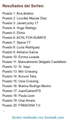 Lista de participantes: Ana destino(3 participaciones), Paula Leon, JuanGamer019(2 participaciones), Miri Crossing(3 participaciones), Sr. loqui(5 participaciones), Space YT(3 participaciones), Manuelmonto Delgado Castellano(3 participaciones), Emma Losada(3 participaciones), Lucia Rodriguez(3 participaciones), Unai Arranz, Lourdes Macias Diaz, Elvira(21 participaciones), Uxia Crossing(3 participaciones), Marina Rodrigo Merino, ACNL FUN ALWAYS(9 participaciones), JavierLucky 17, Adriana Garcia(2 participaciones), Mario Cerdan Payo, Hugo Rodrigo, Nuria Rena, FRANCINA T.V., Kurumi Toka.