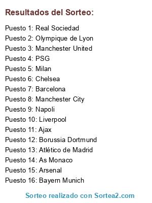 Lista de participantes: PSG, As Monaco, Arsenal, Olympique de Lyon, Manchester United, Chelsea, Milan, Barcelona, Liverpool, Manchester City, Napoli, Real Sociedad, Bayern Munich, Ajax, Atlético de Madrid, Borussia Dortmund.