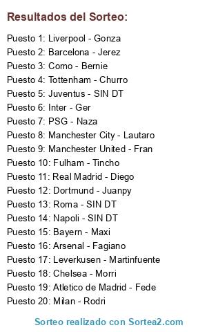 Lista de participantes: Barcelona - Jerez, Real Madrid - Diego, Atletico de Madrid - Fede, Manchester City - Lautaro, Manchester United - Fran, Liverpool - Gonza, Chelsea - Morri, Arsenal - Fagiano, Fulham - Tincho, Tottenham - Churro, Inter - Ger, Juventus - SIN DT, Milan - Rodri, Como - Bernie, Napoli - SIN DT, Roma - SIN DT, Bayern - Maxi, Leverkusen - Martinfuente, Dortmund - Juanpy, PSG - Naza.