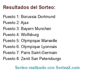 Lista de participantes: Paris Saint-Germain, Borussia Dortmund, Zenit San Petersburgo, Ajax, Olympique Lyonnais, Bayern Munchen, Olympique Marseille, Wolfsburg.