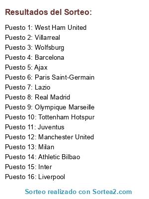 Lista de participantes: Real Madrid, Villarreal, Athletic Bilbao, Barcelona, West Ham United, Liverpool, Tottenham Hotspur, Manchester United, Inter, Juventus, Lazio, Milan, Paris Saint-Germain, Wolfsburg, Olympique Marseille, Ajax.