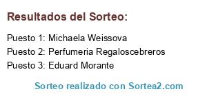 Lista de participantes: Guadalupe Tejera Alvarez, CharlesRobert Darwin, Lucía Martínez Barral, Rosa Fernandez Jimenez, Maribel Claros, Joel Cerqueda, Zama Raper, Alicia Algar Melero, Juan Nicás Perales, Leticia Gavilan Martin, Silvestre Benavente Macanas, Estela Perez Ruiz, Martamiguelana Beni, Ayna Trotamundos, Perfumeria Regaloscebreros, La Quinta Esencia, Tu Estilo Lencería Fina, Juan Espinosa, Maria Colomo Diaz, Mami Duna Carolina, Alex Pilici, Ainhoa Patricia Juárez, Teresa Camara Montelio, Concepcion Matias Simarro, Elaine Bernardi, M Luisa Pérez, Felix Pinilla, Luisa Maria Garcia Repiso, Maria Victoria Martos Sanchez, Patry Frag Mart, Katerina Knyazhechenko, Carmen Essence, Paweł Kiljan, Rosa Casas Lopez, Corner Once, Zulema Pontes Vidal, Antonio Serrano Puentes, Pruden Pastor, Ana Cristina Sanchez Peña, Eduard Morante, Lucia Perez, Jose Miguel Illan Roca, Michaela Weissova, Belen Risco Rojas, Soledad Rodriguez Lopez, Susan Pl, Pepi Romero Alvarez, Veronica Garcia(2 participaciones), Jennifer Romero, Angelines Fernandez, Cipriano Moreno Aparicio, Joan Galvez Lanzas, Josefa Gálvez Lanzas, Toñi González Herrera, Angela Carpente Garcia, Eva Mariño Sánchez, Georgina Sanroma Ortega, Veronica Sumillera, Peter Maza Gallego, Paquita Alvarez, Almudena Arocha Martos, Roci Fraga, Elena Maria Jara Garcia, Lydia Lopez Millan, Vanesa Calvo Chao, Irene Diaz, Raquel Garcia, Alfredo Peralta, Susana Rosell Navarro, Natalia Cuello, Carlos Fernández, Maria R Simon, David Pereira Martínez, Sophia Sanchez Peña, Sergio Arnaiz Delgado, Mini Torres, Beatriz Crem, Sonia Florido Jimenez, Carolina Velázquez Cobo, Irene Masip Morte, Angeles Sánchez Sicilia.
