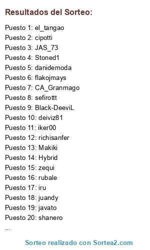 Lista de participantes: mescamilla, richisanfer, cipotti, Stoned1, Hybrid, mistian11, assalito, rubale, juandy, poletinho10, deiviz81, flakojmays, danidemoda, zequi, domin, javato, jpc89, cortex, roqueluis, iker00, iru, ruben94, sylca, shanero, sefirottt, rivaltales, el_tangao, CA_Granmago, Makiki, harrytxu, JAS_73, Black-DeeviL.