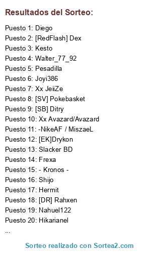 Lista de participantes: VallejoMC [LPT], [RedFlash] Dex, [LPT]dan2793, kokixx, Joyi386, Agustinm33, Hikarianel, [Staars]Mixel, Matiasnfsmw, [SB] Ditry, -Manjoume_jun-, Slacker BD, Shijo, Yerson, Kesto, JugadorAmigo, Kalarse, Blaniom, BlueBlood/RexTheHaxer, -Windalf- , Hiken, Xx Light, Xx Avazard/Avazard, - Kronos -, [AK] Mugiwarra, [DR] Rahxen, -NikeAF / MiszaeL, Playback, [SV] Pokebasket, Xx JeiiZe, Pesadilla, Frexa, -Greencore-, [HP]ShadowFC, Armyx, Aprhodi, Roche - Mr. R, Lary, Benis, Masterms32, Walter_77_92, [EK]Drykon, Hermit, Atari, Nahuel122, Ferchu, [AK] Kisame, [AK] Denny, Diego.