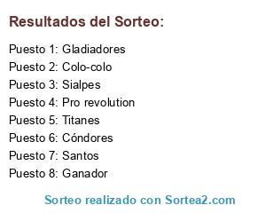 Lista de participantes: Colo-colo, Cóndores, Titanes, Pro revolution, Gladiadores, Ganador, Santos, Sialpes.