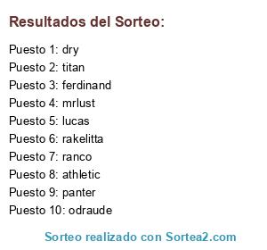 Lista de participantes: selene, dry, lucas, rakelitta, poke, elipaina, f1978, athletic, dios, ferdinand, panter, pollito, eduardo, gatito, dra3, seve, sami, sun-ken, mrlust, paparra, elxcluido, pon, mushy, machi, pin, ranco, big_lion, titan, don atc, und3ad, zhizuz, aupa_atleti, duckman28, chibi, odraude.
