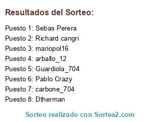 Lista de participantes: Richard cangri, Guardiola_704, carbone_704, Dtherman, mariopol16, arballo_12, Sebas Perera, Pablo Crazy.