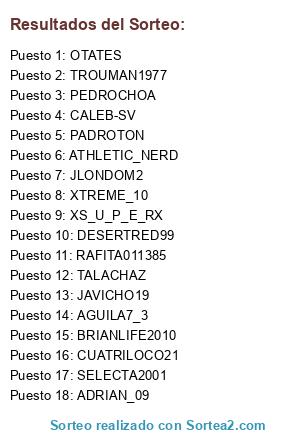 Lista de participantes: JLONDOM2, SELECTA2001, AGUILA7_3, PEDROCHOA, XS_U_P_E_RX, CALEB-SV, OTATES, XTREME_10, CUATRILOCO21, TALACHAZ, PADROTON, TROUMAN1977, RAFITA011385, JAVICHO19, ATHLETIC_NERD, ADRIAN_09, BRIANLIFE2010, DESERTRED99.