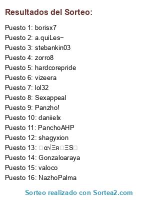 Lista de participantes: hardcorepride, valoco, ਹα√ΞяძΞSฬ, PanchoAHP, lol32, vizeera, borisx7, NazhoPalma, shagyxion, daniielx, Gonzaloaraya, Panzho!, zENtAuRo, zorro8, a.quiLes~, Sexappeal, stebankin03.
