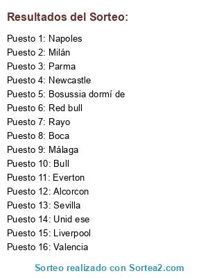 Lista de participantes: Boca, Everton, Sevilla, Napoles, Red bull, Liverpool, Milán, Málaga, Bull, Rayo, Valencia, Unid ese, Alcorcon, Newcastle, Parma, Bosussia dormí de.