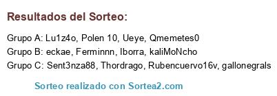 Lista de participantes: eckae, Sent3nza88, Thordrago, Ferminnn, gallonegrals, Iborra, Rubencuervo16v, Lu1z4o, Qmemetes0, Polen 10, Ueye, kaliMoNcho.