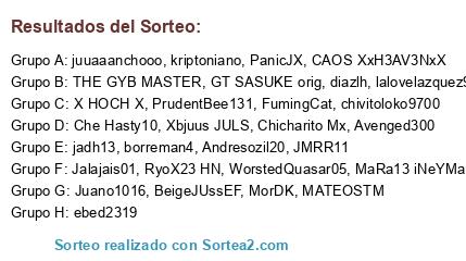 Lista de participantes: Juano1016, MATEOSTM, lalovelazquez9, PrudentBee131, ebed2319, GT SASUKE orig, WorstedQuasar05, CAOS XxH3AV3NxX, PanicJX, MorDK, RyoX23 HN, Avenged300, THE GYB MASTER, Jalajais01, Chicharito Mx, juuaaanchooo, Xbjuus JULS, chivitoloko9700, diazlh, borreman4, kriptoniano, Andresozil20, JMRR11, FumingCat, jadh13, Che Hasty10, X HOCH X, BeigeJUssEF, MaRa13 iNeYMaRx.