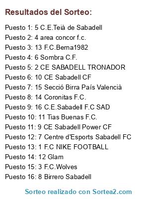 Lista de participantes: 1 F.C NIKE FOOTBALL, 2 CE SABADELL TRONADOR, 3 F.C.Wolves, 4 area concor f.c., 5 C.E.Teià de Sabadell, 6 Sombra C.F., 7 Centre d'Esports Sabadell FC, 8 Birrero Sabadell, 9 CE Sabadell Power CF, 10 CE Sabadell CF, 11 Tias Buenas F.C., 12 Glam, 13 F.C.Berna1982, 14 Coronitas F.C., 15 Secció Birra País Valencià, 16 C.E.Sabadell F.C SAD.