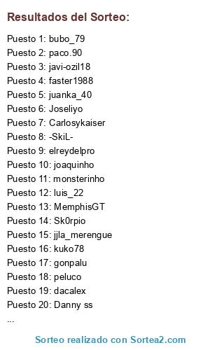Lista de participantes: 2102, _-CaTa-_, _valin_, adarrec, adrianmaese, adry_talega, Agu_CWM, aguilera--alex, airs18, alban659, albertero, albesa, alejandrozgz, ALFON_91, alicate, ALNA25, alvarito956, angelcop83, Anthony__1989, APOCALIPSIS, assalito, asturjorge98, BaLaGoL, benitosk8, beto_beto_99, Blate-star10, bubo_79, bukanero77, BurfoK, bustammm, cabernicola25, camino88, carlos_1108, carlosbetico, Carlosykaiser, cesarotor, chicharou, CHiMeNiNHo, chiquiteam, cipotti, claudinho10, claudinho10mala, Constrac, cortex, cp1991, Cr7thebest, d4v1d_f3n1x, dacalex, dani_caseria, danielo0o0, danikoso, Danny ss, danyk, davidrs28, davilinho1978, Deiviz, djboke2593, djchicue, DJJcarlos, djsnake, djss_, DomiN, -DRebo-, DUGLASS, egidopau, el7despain, ELPUMA, elreydelpro, erich19, erkobra, faster1988, Flako_jmays, forengas, fredystation, frenxa, frias_01, gandalfiol, glottis, gonpalu, HaRRyMoN, Hybrid, ICG14, IKER 00, Isra_21, J.Robles 21, Javi Pandiani, javi-ozil18, javipocas, Javiruly18, jcarlinho19, jimeninho84, jjla_merengue, joanfcb, joaquinho, JORGE__73, Joseliyo, joselmiro, joselu25, joseraspk, jotemo87, juabillo, juandy1989, juanka_40, juanvi2010, juliusgandalf, Kamaleon1991, kamikace21, kuko78, kurry82, lakylu, latre, lolinhoutrera, lolito22, luis_22, luisiko_elx, lumpa7, macvid, MaKiKiLL, mariony99, marlito, marlitoo, mateyita, maykelillo9, MeeLLii5, MemphisGT, mescamilla, migue86, miguelito_ccy11, mistian11, monsterinho, morpheo27, nachomori24, naruto24, nino_17, NorriS_28, Olibong, oskar16, osvaldiito, Owodjaye82, pablo_brihuega, pabloartista, paco.90, peluco, PiLaCRaZY, piliza, pitu1493, PL-Smolldinho, PL-Superdinho, Puertas80, R10T, rafanaa, ratony18, Raven, richi_sanfer, rimper, Rios_10, rivaltales, Rocabilli, rojobarny, ROLHy, roqueluis, ruperrouba, sanxo, ScOrP1oN, sefirottt, sergidela, sergiosankris, shadow85mlg, Shaitan69, ShelbyGT, Sieg85, sinmote39, Sk0rpio, -SkiL-, snaidej, SOLERA_22, Splass, SuperPucela, tambordelaoje, tengolas3, thexedo89, tilyko, torete33, torviteam, Trammel, TRONKY24, troyano24, Tunkayonki, v1k1ng0rmcf, Vampiro_Night, vicente_el_mas, vichin7, viciado, villapons1, wakandu, xakixan, xino_xinytto, xristo_14_, xXSeVi_STyLeXx, yerburto, Zarra, ZeQuI, Zlatantf.