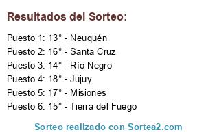 Lista de participantes: 13° - Neuquén, 14° - Río Negro, 15° - Tierra del Fuego, 16° - Santa Cruz, 17° - Misiones, 18° - Jujuy.