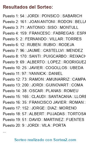 Lista de participantes: 1 PALISANDRO DAVID GAMEZ MERCADER, 2 FERNANDO VILLAR TORRES, 3 XAVIER OLIVE OLIVE, 4 MARIA JESUS (LUNA) REINALDOS HERNANDEZ, 5 JOSE MIGUEL AMOR LARRUSCAIN, 6 CARLES GRAU MAYR, 7 NURIA LORENTE HERNANDEZ, 8 DIDAC PARDELL SANGRA, 9 JORDI VILA PORTA, 10 ADRIA PARDELL SANGRA, 11 ALBERTO BOFILL IBORRA, 12 RUBEN RUBIO RODEJA, 13 JORDI GARCIA RIVERO, 14 JULIO ALVAREZ OTERO, 15 FRANCESC XAVIER MARBA BOVE, 16 GERARD RAMOS LLAURADO, 17 JUAN ANTONIO LOPEZ MIRALLES, 18 MANUEL GARCIA CABRERA, 19 VICTOR CARRERA STROEBEL, 20 JOSEP BOQUE TOSAS, 21 JOEL BOQUE CANUDAS, 22 RICARD FILELLA FARGAS, 23 RAMON ESCARRA VADILLO, 24 JAUME CARNICE REÑE, 25 JAVIER COGOLLOS UBEDA, 26 ANGEL GUAL ESTRUCH, 27 TONI CAVALLE FERRE, 28 RAMON GARCIA BUSQUETS, 29 FRANCESC BASTE DURAN, 30 XAVI SENTIS VILA, 31 CARLES BERTRAN ALBET, 32 DAVID RAMIREZ VAZQUEZ, 33 JOAN ADELL RAMOS, 34 JAVIER ROMERO PALMA, 35 FRANCISCO JAVIER ROMAN MARTIN, 36 JOSEP MARIA VALERO IBAÑEZ, 37 MATIES LLAURADO LLAURADO, 38 OSCAR PLANAS ROMEU, 39 OSCAR TORTOSA CUBELES, 40 JULI VALLMITJANA VILARO, 41 JORDI SALART VIÑALS, 42 LLUIS ROVIRA UBACH, 43 JUAN RAMON ANENTO TENA, 44 JOAN M. PIERA ANDREU, 45 RICARD NAVARRO MARGALEF, 46 ENRIC NAVARRO TEIXIDO, 47 JORDI ESTIL.LES FORT, 48 JOSE GREGORIO JURADO, 49 ANTONIO MOYANO RICOTE, 50 VICENS NAVARRO MARGALEF, 51 DAVID MARTINEZ FUENTES, 52 JUAN BAUTISTA PEREZ SEVILA, 53 RAMON ROSELL BUSOMS, 54 JORDI PONSICO SABARICH, 55 MIQUEL XAUS RAFI, 56 FERNANDO COGOLLOS UBEDA, 57 ALBERT PUJADAS TORTOSA, 58 CARLES CECILIA MASGRAU, 59 JOAN CIURANA COMTE, 60 JACINTO SERRA MORALES, 61 JOAN PERE MASDEU MARTIN, 62 ROBER MILLAN URBANO, 63 JAUME BORBONES JUANPERE, 64 JOSEP SOLER BATLLE, 65 GUILLEM ALTES RUA, 66 OSCAR SOLE VILLAFRANCA, 67 EDUARD GARANGOU LLENAS, 68 ALBERT CORIA RIBO, 69 ALBERTO LOPEZ RODRIGUEZ, 70 TONI NAVAS TORRA, 71 ANTONIO SISO MONTULL, 72 IÑAKI GARCIA HERNANDEZ, 73 RAMON AMUNARRIZ CAMPANDEGUI, 74 ROGER PLA BONAPARTE, 75 GERARD GUIVERNAU AGUADE, 76 JAIME CABRE SERRANO, 77 ALEX ANGULLO HERNANDEZ, 78 EDUARD GRAU MARISCAL, 79 JOSEP M. LLEDOS PALAU, 80 VICTOR ESCRIBA VIDAL, 81 JORDI LAX UGARTE, 82 TONY HURTADO SAEZ, 83 LUIS ALCOBE OLLE, 84 JOSE MARIA DALMAU TERRADAS, 85 JOSEP COSIALLS MASSA, 86 ENRIQUE GARRIGA GARCIA, 87 ALVARO ROBLES MARDARAS, 88 JORDI MODENES ZANGO, 89 JOAN GUBERN SOLA, 90 EMILI CASTELLS MARGARIT, 91 JORDI ESTEVE ORO, 92 CARLES LLOPIS GONZALEZ, 93 JORDI SAUMELL COMPANY, 94 DAVID BOSCH DEVESA, 95 JOSEP PEREDA BURGOS, 96 JAUME CASTELLVI MENDEZ, 97 YANNICK DANIEL, 98 JAVIER GONZALEZ, 99 JOAN CARLES GALLART TORRAS, 100 MANUEL MARTINEZ BAEZA, 101 AUGUST TARRAGO SABAT, 102 ALBERT VINYES SANCHEZ, 103 MARCELINO VICENTE VICENTE, 104 CARLES FERRANDO VILLARROYA, 105 JOAN VENDRELL GOMBAU, 106 FRANCISCO RODRIGUEZ SUAREZ-BARCENA, 107 RAUL RUIZ ESPUÑES, 108 ROGER LLINAS GEA, 109 JORDI PAULS GIMENO, 110 TONI VENDRELL GOMBAU, 111 ORIOL FRANCO RIERA, 112 MARC SERRAT BOTE, 113 JAVIER TEBA PEDRERO, 114 ALBERT ROYO SANVISEN, 115 LLORENÇ BORDAS MARTI, 116 ELEUTERI ROIG PUJOL, 117 JOSEP RAMON BARDIA TARRAGO, 118 EMILIO CERCANO FERNANDEZ, 119 JAVIER CERCANO MATEO, 120 JORDI SANCHEZ MEMBRILLA, 121 ALBERT BUXADE HERRERA, 122 F. XAVIER MORERA TORRUELLA, 123 PAU BUDIA MONTERDE, 124 PEP HUMBERT FIGUERAS, 125 PEDRO GIMENO FITE, 126 LLUIS CARBO FLECHA, 127 XAVIER SERRAVINYALS ARUMI, 128 RAFAEL CASTILLA MARTINEZ, 129 ROC SINDREU TREPAT, 130 ANTONIO MENENDEZ MARTINEZ, 131 THOMAS VEKEMANS, 132 ANTONI TORE PUJOL, 133 DANI GISPERT FORT, 134 EDUARD MORAGUES GALLOFRE, 135 JUAN MIGUEL ROCA CUETO, 136 JOSEP M. GREOLES MASA, 137 JUAN ANTONIO BARRUFET BOSCH, 138 JOSE CARLOS VICENTE FIRMINO, 139 RORY LAMBERT, 140 FERNANDO VIZCAINO CABALLERO, 141 MARC HOM FLORENZA, 142 JOAN FIGUERAS FELIP, 143 ROBERTO ANDRES MERCHAN PARRA, 144 JOSEP ELSEN BRAUTIGAM, 145 JESUS SERRANO CEBRIAN, 146 PAU VIDAL GARCIA, 147 JOSE MARIA AUBESO SIERRA, 148 ANTONIO GUILLAMON PAGES, 149 MIGUEL ANGEL SERNA GARCIA, 150 JORDI FIGUERAS GRAS, 151 ANDRES CASTILLO GARCIA, 152 JORGE DIAZ MORENO, 153 XAVIER FABREGAS NIETO, 154 HILARIO NOVILLO TRINIDAD, 155 SERGI MARTIN ANTON, 156 RAMON MENSA MARTI, 157 DIDAC RIUS VILACLARA, 158 MANUEL GARCIA LOPEZ, 159 FRANCESC FABREGAS ESPANYO, 160 JOSEP M. RODON BELLALTA, 161 JOAN ANTONI RODON BELLALTA, 162 JOSEP M. ROCA MASERAS, 163 LLUIS ROSSELLO PIERA, 164 JOSEP FERRERES CASAS, 165 CLAUDI SANTACANA LLORENS, 166 JOSE DANIEL ESPARZA SIRERA, 167 RAMON CANES SAN NICOLAS, 168 LLUIS FERNANDEZ DARDER, 169 RAFAEL CASADO DEL TIO, 170 SANTI PUIGCARBO REIXACH, 171 CARLES FERRER RICO, 172 PEP VILASECA COLELL, 173 EDUARD OMEDES REGAS, 174 IGNACIO MARTI TRIGINER, 175 AMADEO ROIG CASANOVA, 176 EDUARD BAVIERA BEA, 177 AGUSTI CARBONELL YAÑEZ, 178 FRANCESC RELEA GINES, 179 MIGUEL ANGEL MALDONADO MARTINEZ, 180 JOAN CARLES VILA TORRUELLA, 181 FRANCESC OLIVA PARERA, 182 ENRIC RABASSA RABASSA, 183 MANEL COMAS GARRIGOS, 184 LLORENÇ MAS LAZARO, 185 AGUSTI MARTI RUJAS, 186 LUIS GUTIERREZ RODRIGUEZ, 187 VICTOR GARCIA QUEROL, 188 ANTONI LLORENS MARINA, 189 JORDI CARRERAS SANAHUJA, 190 ALFRED AUBI ZANGO, 191 CARLOS LOZANO SANCHEZ, 192 SERGI SERRA PEREZ, 193 JULIO TENA GISBERT, 194 JOSE MARIA BORDAS MARTI, 195 EMILI MENCIA CATALAN, 196 JORDI SAMPER ROS, 197 GERMAN CORBELLA GARCIA, 198 DAVID IGLESIAS GRACIA, 199 ANTONI PALAU IBARS, 200 JORDI GUINOVART COMA.