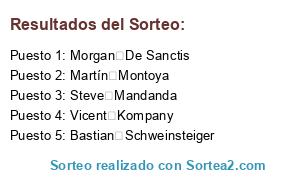 Lista de participantes: Morgan De Sanctis, Steve Mandanda, Manuel Neuer, Sofiane Feghouli, Keisuke Honda, Raul Meireles, Bastian Schweinsteiger, Filipe Luis, Joao Pereira, Martín Montoya, Eduardo Salvio, Dante Costa Santo, Aleksandar Dragovic, Vicent Kompany, Paco Alcacer, Jermain Defoe, Rodrigo Moreno.