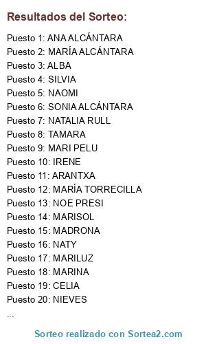 Lista de participantes: IRENE, MARILUZ, MARI PELU, MADRONA, NOE PRESI, ALBA, ANIKA, ARANTXA, CELIA, CLAU, ELENA GARRE, MARISOL, NAOMI, NATALIA RULL, NATY, NIEVES, RUSYKA, SILVIA, SONIA ALCÁNTARA, TAMARA, TOÑI, ANA ALCÁNTARA, MARÍA ALCÁNTARA, MARÍA TORRECILLA, MARINA.