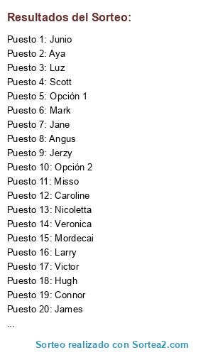Lista de participantes: Angus, Aya, Caroline, Connor, Hugh, James, Jane, Jerzy, Junio, Larry, Luz, Mark, Milton, Misso, Mordecai, Nicoletta, Randall, Scott, Veronica, Victor, Opción 1, Opción 2.