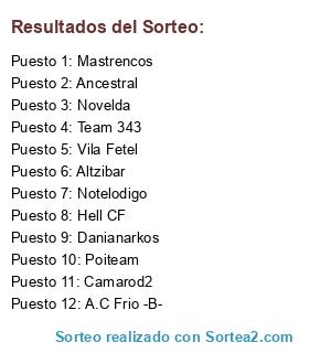 Lista de participantes: Altzibar, Notelodigo, Poiteam, Danianarkos, Vila Fetel, Mastrencos, Ancestral, Novelda, Hell CF, Team 343, Camarod2, A.C Frio -B-.