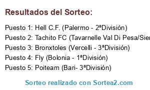 Lista de participantes: Fly (Bolonia - 1ªDivisión), Hell C.F. (Palermo - 2ªDivisión), Poiteam (Bari- 3ªDivisión), Bronxtoles (Vercelli - 3ªDivisión), Tachito FC (Tavarnelle Val Di Pesa/Siena - 3ªDivisión).