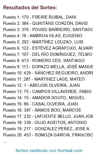 Lista de participantes: 1 - ABEIJON OLVEIRA, JUAN, 2 - ABEIJON RODRIGUEZ, JOSE ALBERTO, 3 - AGRAFOJO LORENZO, FRANRA, 4 - AGRAFOJO PEREIRA, RAFAEL, 5 - AGRASO POUSO, JOSÉ ANTONIO, 6 - AGRASO TORRES, ALFONSO, 7 - AGULLEIRO, JOSE MIGUEL, 8 - ALCALDE GARCIA, JAVIER, 9 - ALONSO CASTRO, MIGUEL ANGEL, 10 - ALONSO FERNANDEZ, ANTONIO, 11 - ÁLVAREZ REY, PATRICIA, 12 - ALVAREZ VAZQUEZ, JOSÉ ANTONIO, 13 - ALVAREZ VILLAR, ALEJANDRO, 14 - ALVITE GONZALEZ, JUAN ANTONIO, 15 - AMADOR SOUTO, MIGUEL, 16 - AMARELLE FERNANDEZ, MANUEL, 17 - AMARELLE PALLAS, ASIER, 18 - AMBROA VILAS, EUGENIO, 19 - AMIGO HUERGA, ROBERTO, 20 - AMONDARAIN MARTINEZ, DANIEL, 21 - AMOR HAZ, MIGUEL, 22 - ANDRADE OTERO, ANDRES, 23 - ANTELO MARTINEZ, JOSÉ RAMÓN, 24 - ARCAY LOUREIRO, ANSELMO, 25 - ARUFE FERNANDEZ, IVAN, 26 - ASTRAY LÓPEZ, ENRIQUE, 27 - ATIENZA MERINO, GERARDO, 28 - BAAMONDE OTERO, ERO, 29 - BALOIRA CARRO, IVAN, 30 - BARCA GARCÍA, PABLO, 31 - BARCA VARELA, ALEJANDRO, 32 - BARCIA CASTRO, JOSE LUIS, 33 - BARGO DOSIL, JESUS, 34 - BARREAL REQUEJO, DIEGO, 35 - BARREIRO FURELOS, MARCOS (PICAFOLLA), 36 - BARREIRO MOAS, ANGEL, 37 - BARREIRO RODRÍGUEZ, ÓSCAR, 38 - BARROS GARCIA, DIEGO, 39 - BEIRO LESTÓN, DOMINGO, 40 - BEIS SANCHEZ, CARLOS, 41 - BELLO, ALEJANDRO, 42 - BELLO MEIJIDE, FERNANDO, 43 - BENAVIDES PUENTE, ADRIÁN, 44 - BERIAS LAIÑO, LUÍS MIGUEL, 45 - BERNARDEZ FERREIROS, GUSTAVO, 46 - BLANCO DOSIL, SILVIA, 47 - BLANCO LAMAS, MIGUEL, 48 - BLANCO PENSADO, JONATAN, 49 - BLANCO PORTO, JUAN ENRIQUE, 50 - BOTANNA SEOANE, LUIS, 51 - BOUZAS GORGAL, MANUEL, 52 - BOUZAS REY, ISMAEL, 53 - BOUZAS REY, PABLO, 54 - BOUZAS TEIRA, ANTONIO, 55 - BRENLLA FAJIN, SATIRO, 56 - BUJAN, ÁNGEL, 57 - BUJAN SANTOS, EDUARDO, 58 - BUJAN SANTOS, JOSE MANUEL, 59 - BUSTELO GOMEZ, PABLO, 60 - BUSTO GALLARDO, JOSE MANUEL, 61 - BUSTO LOBATO, MANUEL, 62 - CAAMAÑO, AVELINO, 63 - CAAMAÑO, MOISES, 64 - CACHARRÓN ARMENTAL, CARLOS, 65 - CALO PEREZ, MARTIN, 66 - CALVIÑO CARREÑO, JOSE, 67 - CALVO CURRÁS, RAMÓN, 68 - CALVO GARCÍA, TARSI, 69 - CALVO QUINTANS, JOSE MANUEL, 70 - CALVO REY, IVAN, 71 - CALZAS INSUA, DAVID, 72 - CAMEAN CAMEAN, ROBERTO, 73 - CAMIÑO FRAMIL, JOSE ANTONIO, 74 - CAMPOS ALONSO, DIEGO, 75 - CAMPOS VILLAVERDE, FABIO, 76 - CANEL REINO, IVÁN, 77 - CAPINEL SILVA, JOSE ANGEL, 78 - CARBALLEIRO VILAR, SUSO, 79 - CAROU FERNANDEZ, JOSE RAMON, 80 - CAROU MOLEDO, IAGO, 81 - CARREIRA CERNADAS, JOSE IGNACIO, 82 - CARRO CES, RUBEN, 83 - CARRO MAHÍA, ALEJANDRA, 84 - CASAL ANDRADE, DIEGO, 85 - CASAL MOLEDO, ANTIA, 86 - CASAL OLVEIRA, JUAN, 87 - CASAL VAZQUEZ, NACHO, 88 - CASTELLANOS REY, PABLO, 89 - CASTELO VAZQUEZ, JOSE RAMON, 90 - CASTRO ABEIJON, FRANCISCO MANUEL, 91 - CASTRO ABEIJON, JUAN CARLOS, 92 - CASTRO BOUZAS, JORGE, 93 - CASTRO CAAMAÑO, CESAR, 94 - CASTRO CALVO, DAVID, 95 - CASUSO CASTRO, MANUEL, 96 - CELA YAGÜE, JORGE, 97 - CEREIJO LADO, JOSÉ MANUEL, 98 - CESPON BUSTO, SILVIA, 99 - CHOUZA VAZQUEZ, JOSÉ MANUEL, 100 - CORNADO ALCALDE, ROBERTO, 101 - CORRALES VIDAL, JOSE ANTONIO, 102 - COSTOYA RODRIGUEZ, SERGIO, 103 - CRUZ RAMA, JOSÉ ANTONIO, 104 - CUIÑA IGLESIAS, DIEGO, 105 - DE JESUS GONZALEZ, JOSE RAMON, 106 - DE LA FUENTE PEREZ, PAULO, 107 - DEL RÍO DOMÍNGUEZ, TELMO, 108 - DIAZ CELADA, ANGEL, 109 - DOMINGUEZ GARCIA, RUBEN, 110 - DOMÍNGUEZ NÚÑEZ, XOSÉ MARIA, 111 - DOMINGUEZ RECAREI, FRANCISCO, 112 - DOMÍNGUEZ VICENTE, ANTONIO JOSE, 113 - DOPAZO MELLA, JOSÉ MANUEL, 114 - DOPAZO MENO, ANGEL, 115 - DOSIL BLANCO, ANTONIO, 116 - DOSIL ROSENDE, PABLO, 117 - EIRÍS ESPAÑA, CARLOS, 118 - ESMORIS CASTIÑEIRAS, RAUL, 119 - ESPARIS SUÁREZ, DIEGO, 120 - ESPASANDIN ROMAR, MANUEL, 121 - ESPERANTE MOLEDO, JOSE, 122 - ESTÉVEZ AGRAFOXO, ÁLVARO, 123 - FABEIRO TEIRA, JOSÉ ANTONIO, 124 - FANDIÑO SANTOS, JORGE, 125 - FERNANDEZ, EDUARDO, 126 - FERNANDEZ, JORGE, 127 - FERNANDEZ ANTELO, FRANCISCO, 128 - FERNANDEZ BELLO, ANDRES, 129 - FERNÁNDEZ BERMEJO, PELAYO, 130 - FERNANDEZ CORZÓN, ALEX, 131 - FERNANDEZ CREO, GUSTAVO, 132 - FERNANDEZ CUTRIN, JOSÉ MANUEL, 133 - FERNANDEZ DURAN, ANTONIO, 134 - FERNANDEZ FERNANDEZ, RUBEN, 135 - FERNANDEZ FORNIS, DAVID, 136 - FERNANDEZ GOMEZ, JOSE FRANCISCO, 137 - FERNANDEZ JUIZ, HUGO, 138 - FERNANDEZ LOJO, AMADOR, 139 - FERNÁNDEZ PAZOS, DIEGO, 140 - FERNANDEZ PEREZ, MARCOS, 141 - FERNANDEZ REY, DESIREE, 142 - FERNÁNDEZ SÁNCHEZ, ISMAEL, 143 - FERNANDEZ SUSAVILA, MARCIAL, 144 - FERNANDEZ VIDAL, ANGEL, 145 - FERRADAS LADO, IVAN, 146 - FERREIRA RODRIGUEZ, ADRIÁN, 147 - FERREIRO FERNANDEZ, ARTURO, 148 - FERREIRO MOLEDO, FRANCISCO, 149 - FERREIROS CREO, SONIA MARIA, 150 - FERREIROS LAPIDO, JOSÉ ANTONIO, 151 - FERRERO QUIÑOY, DAVID, 152 - FERRIN VILLAR, MANUEL, 153 - FIEIRA VILLAR, HECTOR JOSE, 154 - FIGUEIRAS RODRÍGUEZ, MANUEL, 155 - FIGUEIRO CALO, JOSE RAMON, 156 - FIGUEIRO CASTRO, JOSE MANUEL, 157 - FIGUEROA CASAL, JOSE MANUEL, 158 - FLORES PICHEL, RAÚL, 159 - FOLGAR ROMAY, JAVIER, 160 - FONTAIÑA RODRIGUEZ, JOSE RAMON, 161 - FONTENLA LOPEZ, MARIO, 162 - FORTES OTERO, UXIO, 163 - FRAGA GARCIA, JESUS, 164 - FRAGIO, PABLO, 165 - FRAMIL NEGREIRA, DAVID, 166 - FRANCO AREVALO, MIGUEL ANGEL, 167 - FRANCO MATA, DAVID, 168 - FREIRE LEIS, ROBERTO, 169 - FREIRE LISTA, JOSE MIGUEL, 170 - FREIRE RUIBAL, DANI, 171 - FRESCO CASTIÑEIRAS, DANIEL, 172 - FUENTES BLANCO, ESTHER, 173 - GALLARDO BLANCO, SERGIO, 174 - GALLARDO LAGO, ALFONSO, 175 - GAMALLO SANCHEZ, MANUEL, 176 - GÁNDARA LEMA, PERFECTO, 177 - GANDARELA FDEZ, JAVI, 178 - GARABAL MOREIRA, ADRIANO, 179 - GARABAL NIETO, JAVIER, 180 - GARCIA, RAMÓN, 181 - GARCIA COUSO, JOSE LUIS, 182 - GARCÍA FERRO, CHEMA, 183 - GARCÍA GESTO, JOSÉ, 184 - GARCIA GUDE, JAVIER, 185 - GARCIA IGLESIAS, RAUL, 186 - GARCIA MARTINEZ, HUGO, 187 - GARCIA PEREZ, MANUEL RAMON, 188 - GARCÍA PINAL, ANÍBAL, 189 - GARCIA RECAREY, DANIEL, 190 - GARCIA REY, JUAN CARLOS, 191 - GARCÍA RODRÍGUEZ, FERNANDO, 192 - GARCÍA ROMERO, JOSÉ MANUEL, 193 - GARCÍA SANDIÁS, CARLOS, 194 - GARCIA TUÑEZ, OSCAR, 195 - GARCÍA VIDAL, FRANCISCO JAVIER, 196 - GOMEZ BREA, JUAN CARLOS, 197 - GO