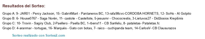 Lista de participantes: 1-rbens11 - CB Sanfeliu, 2-Paellero - Paella BC, 3-Lietuvos27 - Didžiosios Krepšinis, 4-aranmar - tortugas, 5-jesusmr - Chococrestis, 6- House0767 - Saga Norén, 7- raico - cuchipanda team, 8- pataletas- Pataletas.fc, 9- JAR01 - Percy Jackson, 10- Trovin - Sagiry Club, 11- castote - Castellote, 12- SoHo - Al Golpito, 13-rafa98cvc-CORDOBA HORNETS, 14-CarlosV- CB Clausurazos, 15- Gabri4Mart - Pantaneros BC, 16- Marqués - Gato con botas.